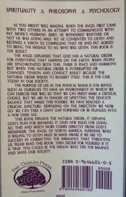 I spoke with Jerry for two hours with Alan, his wife, and my colleague listening to my end of the conversation. Jerry was the original inspiration for the book that his wife Pat wrote. Jerry, a middle-aged man, reported hearing “voices” in 1991, voices that appeared to have a religious message. He felt these voices were angels trying to speak to him. After a year or two of this heavenly nagging, Jerry finally told his wife about the voices and their messages. Pat, a Ph.D. who worked with disabled children, was intrigued enough to write down as much as Jerry could muster. Pat felt inspired to connect with the angel that claimed it represented North America. She began a channeling technique by writing on computer what “her” angel dictated. The manuscript was later presented to Stephen Hawley Martin, a self-made publisher of Oaklea Press that primarily published Martin’s dozen or more books and a few by others. Martin took Pat’s manuscript on (for a price), edited it, and wrote the enthusiastic forward.