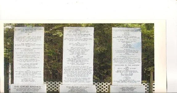 WHERE THE SUN AND THE EARTH/MEET AND TOUCH/ ON AXIS/ + /SO DOES LIFE COME FORTH MORE/ABUNDANTLY UNTO ALL SEASONS/AND UNTO ALL SPECIES/OF LIFE AND EXISTENCE. THE GARDEN OF/MOUNTAIN MEADOW ESTATES/MME/PLANNED RESIDENTIAL COMMUNITY/AND RESORT/HAS BEEN BUILT AS/A LIVING PORTAL/BASED WITHIN AND UPON THE/ANCIENT OF DAYS/GOLDEN UNDERSTANDING OF/THE SACRED GEOMETRY/THAT IS IN ACCORDANCE WITH/THE DNA MOLECULE OF/THE HUMAN GENOME/THAT ALLOWS FOR/THE ACTIVATION OF/LIFE MORE ABUNDANTLY FOR/THE WHOLENESS/OF THE SPECIES HUMAN/AS WELL AS FOR ALL CREATURES/GREAT AND SMALL/NATURE IS HUMANITY'S TEACHER NOW/AND NATURE/MOTHER EARTH/YEA VERILY INDEED. "THE GREAT STONES"
